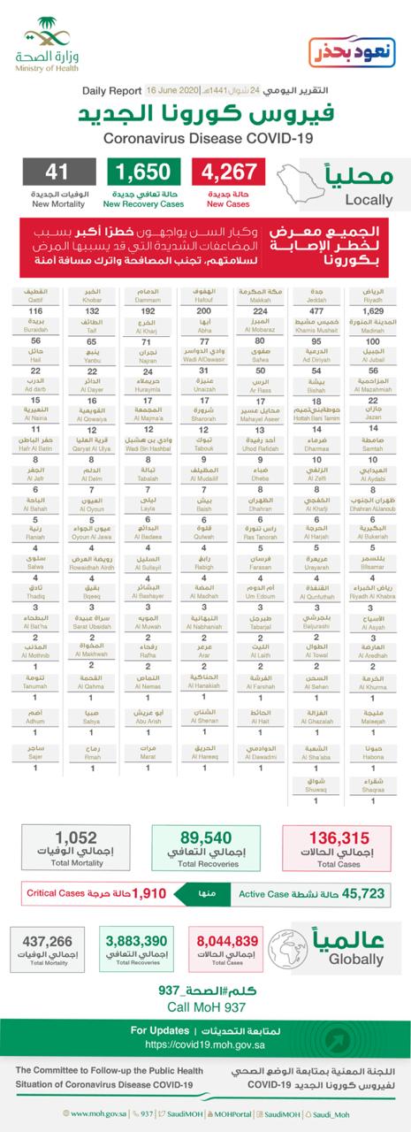 أعلنت وزارة الصحة، اليوم (الثلاثاء)، تسجيل 4267 حالات إصابة جديدة مؤكدة بفيروس كورونا المستجد (كوفيد 19)، ليرتفع إجمالي عدد الحالات في المملكة إلى 136315 حالة.