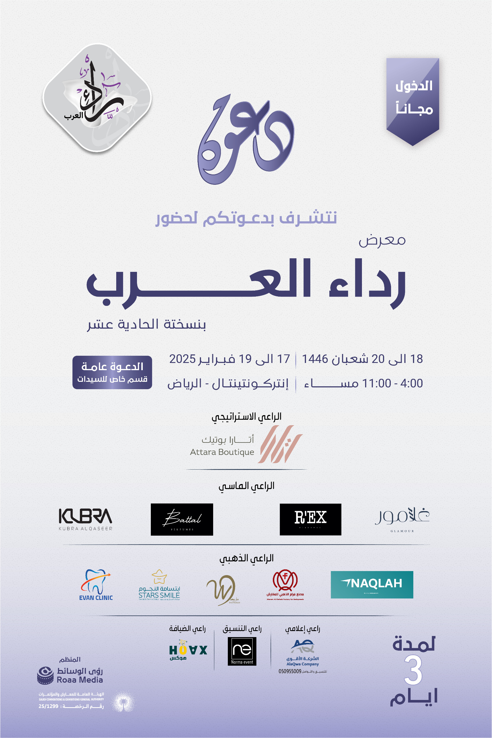 ينطلق معرض رداء العرب في نسخته الحادية عشر في مدينة الرياض بفندق انتركونتننتال ، خلال الفترة من 18 إلى 20 شعبان 1446 هـ الموافق 17 إلى 19 فبراير 2025 ، ويستمر لمدة ثلاثة أيام.