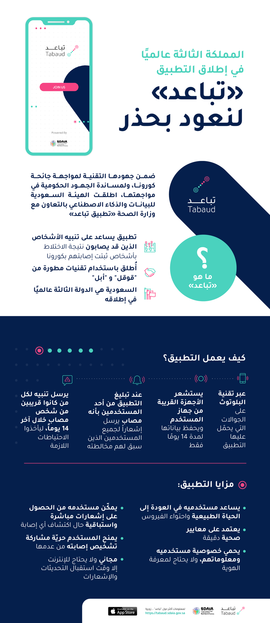 وجاء هذا الإنجاز بعد إطلاق الهيئة السعودية للبيانات والذكاء الاصطناعي (سدايا) تطبيق “تباعد” بالتعاون مع وزارة الصحة، ويعتمد التطبيق على تقنية البلوتوث لاستشعار الأجهزة القريبة من جهاز المستخدم، وحفظ هذه البيانات بشكل آمن لمدة 14 يوماً فقط، بهدف تنبيه المستخدمين في حال مخالطتهم لمصابين في أثناء هذه المدة، ويتم إرسال رسائل التنبيه عند تبليغ أحد المستخدمين بأنه ثبتت إصابته بالفيروس.