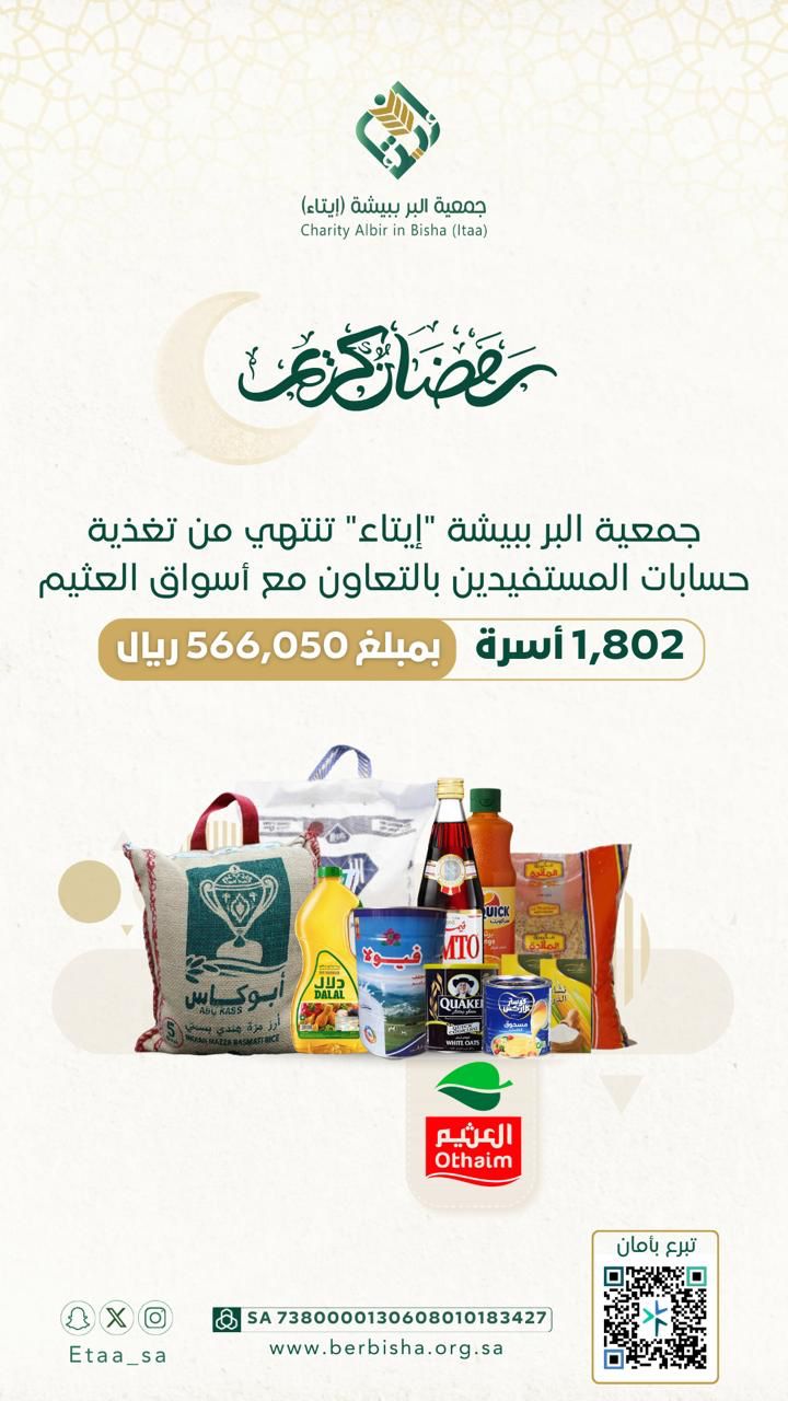 قامت جمعية البر ببيشة “إيتاء” بتغذية حسابات المستفيدين بالتعاون مع أسواق العثيم بمبالغ مالية مخصصة لشراء المواد الغذائية مباشرة ضمن مشروع “السلة الرمضانية”، شملت عدداً من الأصناف الغذائية الأساسية التي تلبي احتياجات الأسر المستفيدة من خدمات الجمعية خلال شهر رمضان المبارك.