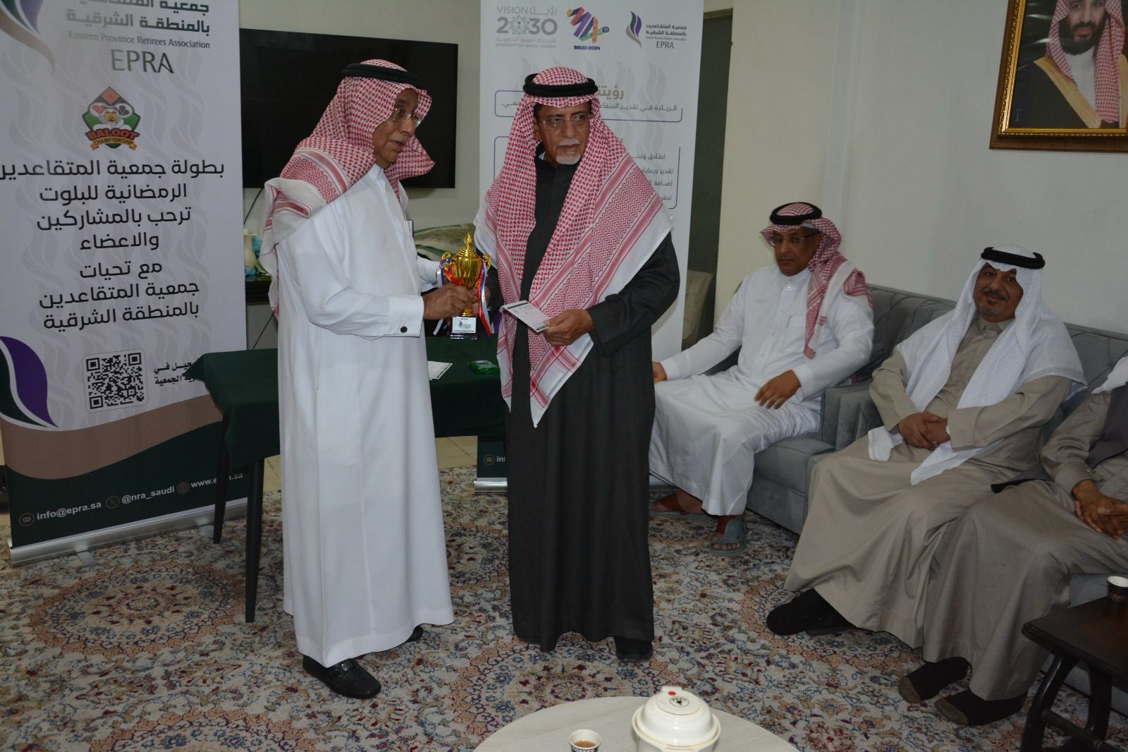 توج رئيس مجلس إدارة جمعية المتقاعدين بالمنطقة الشرقية الأستاذ محمد سليمان القرناس الفريق الفائز في بطولة الجمعية الرمضانية للبلوت، توج المركز الثاني وذلك بعد ختام البطولة التي شهدت تنافس قوي ومثير بين المشاركين وذلك بحضور أعضاء مجلس الإدارة والمشاركين في البطولة وعدد من الأعضاء وذلك في دوانية المتقاعدين بمقر الجمعية.