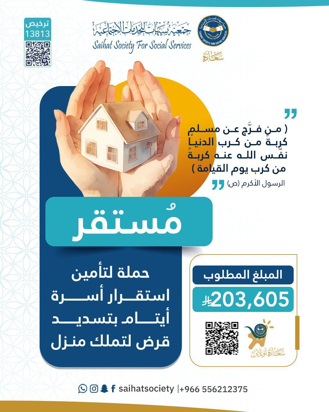 أطلقت جمعية سيهات للخدمات الاجتماعية ” سعادة ” برنامجها « مستقر » لسداد القروض المتعثرة عن المعسرين، معلنة عن الحالة الأولى منه وهو لمنزل أسرة أيتام عليهم سداد المبلغ لفك رهانه.