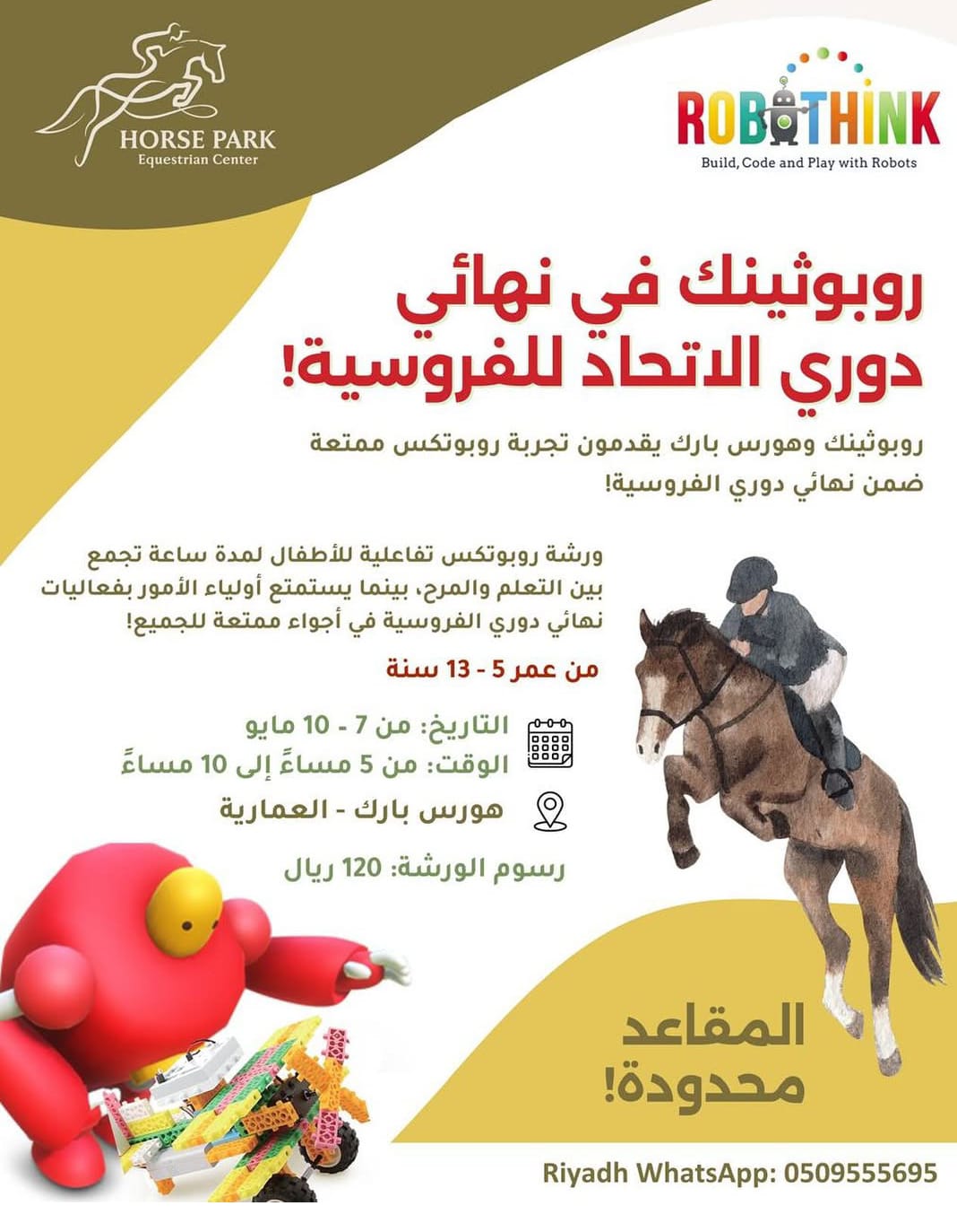 عيشوا تجربة فريدة تجمع بين الترفيه والتعليم مع ورشة روبوتكس تفاعلية للأطفال من عمر 5 إلى 13 سنة، لمدة ساعة من المرح والتعلم، في أجواء حماسية ضمن فعاليات النهائي الكبير لدوري الفروسية – قفز الحواجز!