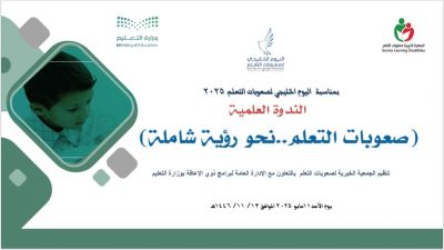 نظّمت الجمعية الخيرية لصعوبات التعلم، بالتعاون مع الإدارة العامة لبرامج ذوي الإعاقة بوزارة التعليم، ندوة علمية افتراضية بعنوان: “صعوبات التعلم.. نحو رؤية شاملة”، وذلك تزامنًا مع الاحتفاء باليوم الخليجي لصعوبات التعلم، وبمشاركة نخبة من المختصين والمهتمين.