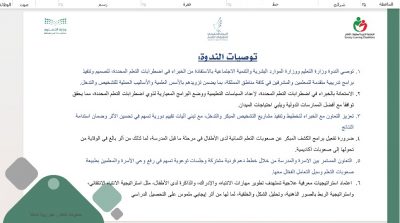 ٢. تفعيل برامج الكشف المبكر عن صعوبات التعلم النمائية لدى الأطفال في مرحلة ما قبل المدرسة، لما لذلك من أثر بالغ في الوقاية من تحوّلها إلى صعوبات أكاديمية. كما أوصت الندوة بتعزيز التعاون بين الأسرة والمدرسة عبر خطط دعم فردية، وجلسات توعوية تسهم في رفع وعي أولياء الأمور والمعلمين بطبيعة هذه الصعوبات وسبل التعامل الفعّال معها.