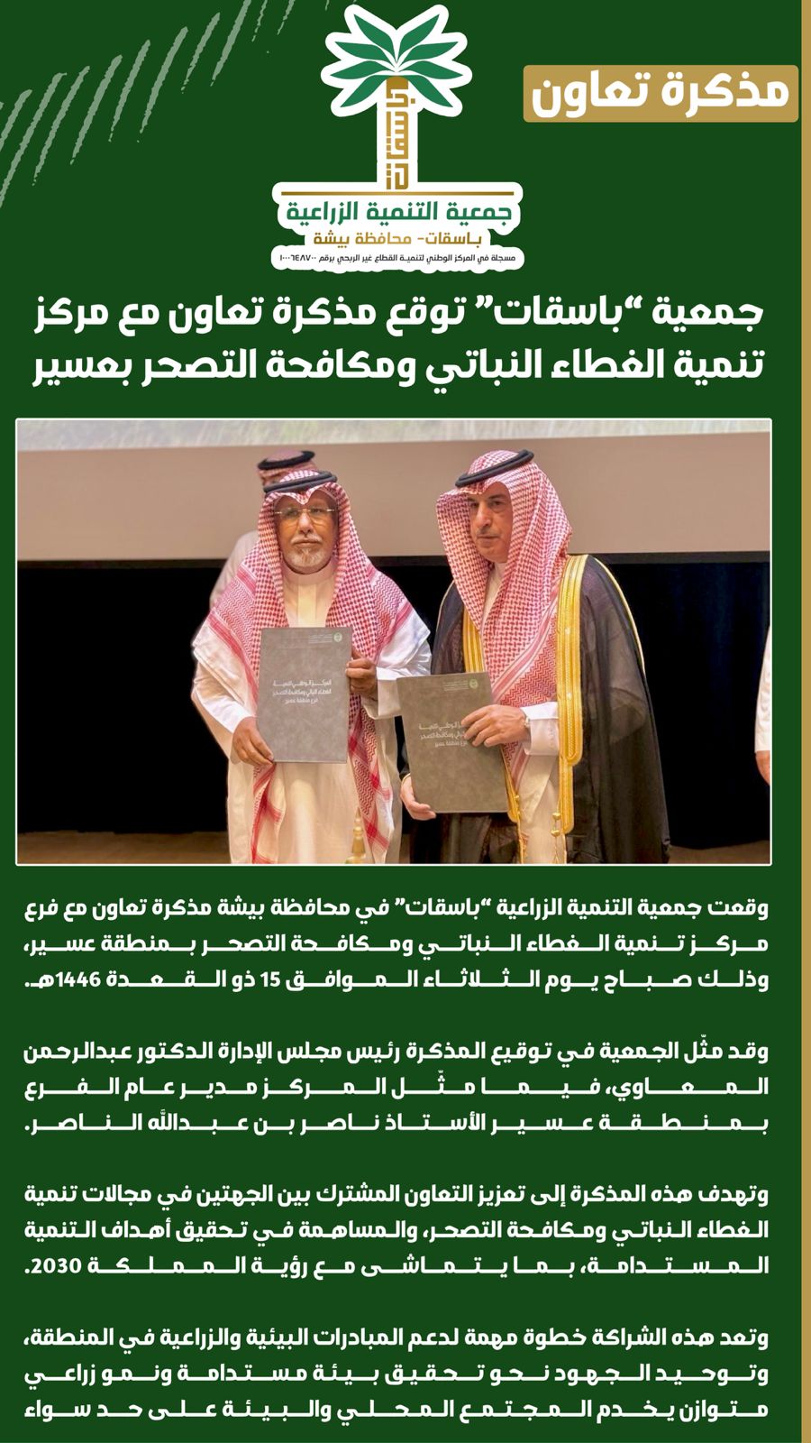 بيشة – وقعت جمعية التنمية الزراعية “باسقات” في محافظة بيشة مذكرة تعاون مع فرع مركز تنمية الغطاء النباتي ومكافحة التصحر بمنطقة عسير، وذلك صباح يوم الثلاثاء الموافق 15 ذو القعدة 1446هـ.