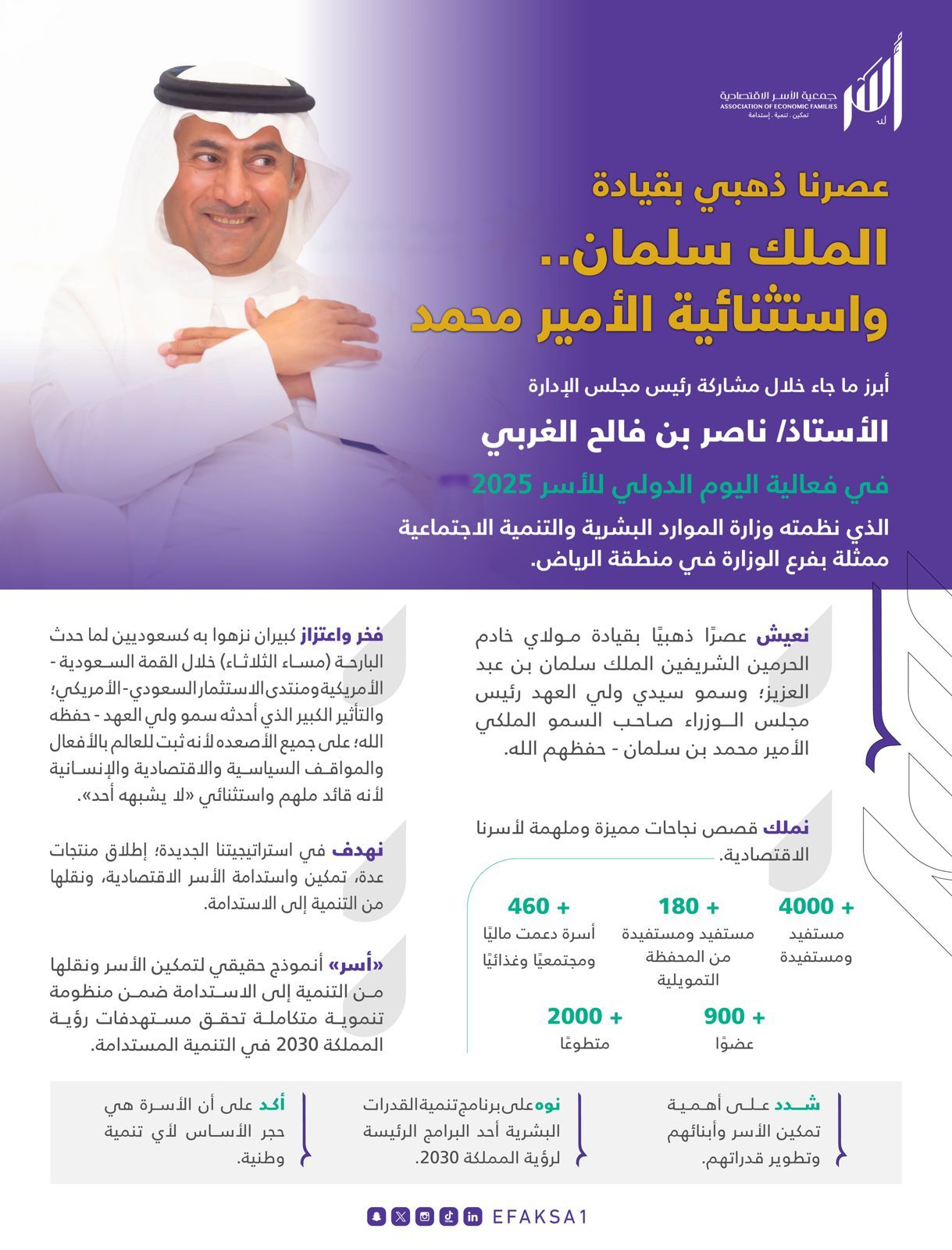 جاء ذلك لمشاركته كمتحدث رئيس في الجلسة الحوارية الرئيسة التي أقيمت ضمن فعالية اليوم الدولي للأسر 2025، الذي نظمته وزارة الموارد البشرية والتنمية الاجتماعية ممثلةً بفرع الوزارة في منطقة الرياض بعنوان “تحليل السياسات الأسرية في ضوء رؤية 2030 والتنمية المستدامة”، اليوم الأربعاء 14 مايو 2025، في فرع فرع الوزارة في مدينة الرياض، حيث استعرض دور الجمعية في دعم الأسر الاقتصادية وتمكينها لتحقيق الاكتفاء الذاتي والمساهمة في التنمية الوطنية.