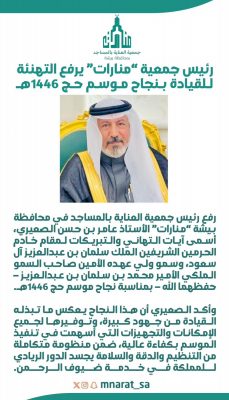 رئيس جمعية “منارات” يرفع التهنئة للقيادة بنجاح موسم حج 1446هـ