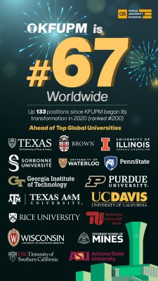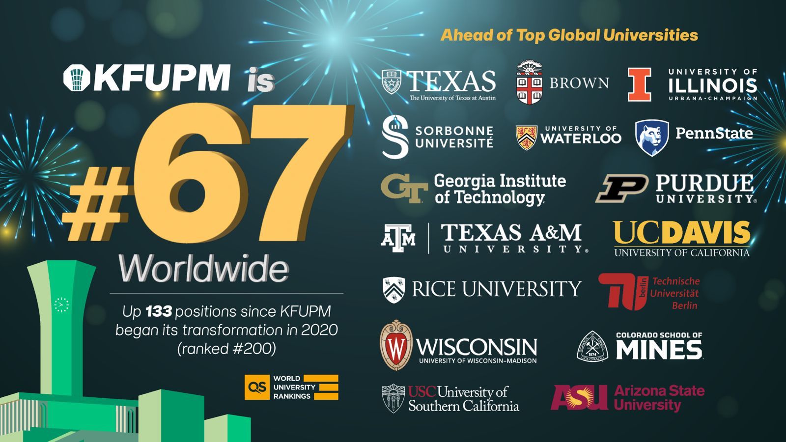 حققت جامعة الملك فهد للبترول والمعادن تقدماً عالمياً جديدًا بدخولها قائمة أفضل 100 جامعة على مستوى العالم، حيث تقدمت إلى المرتبة 67 عالميًا، وفقًا لتصنيف “كيو إس” (QS World University Rankings) لعام 2025. ويُعد هذا التقدم ثمرة مباشرة لمسار التحول الاستراتيجي الذي أطلقته الجامعة منذ عام 2020، حيث انتقلت خلال خمسة أعوام من المرتبة 200 إلى المرتبة 67.