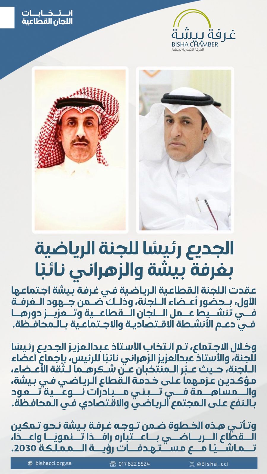 الجديع رئيسًا للجنة الرياضية بغرفة بيشة والزهراني نائبًا