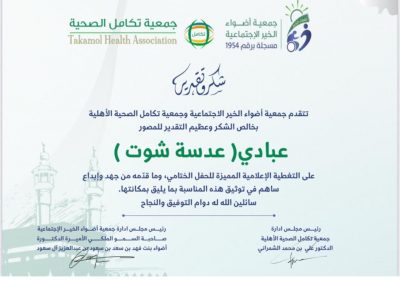 “تتقدم جمعية أضواء الخير الاجتماعية وجمعية تكامل الصحية الأهلية بخالص الشكر وعظيم التقدير للمصور عبادي (عدسة شوت) على التغطية الإعلامية المميزة للحفل الختامي، وما قدّمه من جهد وإبداع ساهم في توثيق هذه المناسبة بما يليق بمكانتها. سائلين الله له دوام التوفيق والنجاح.”