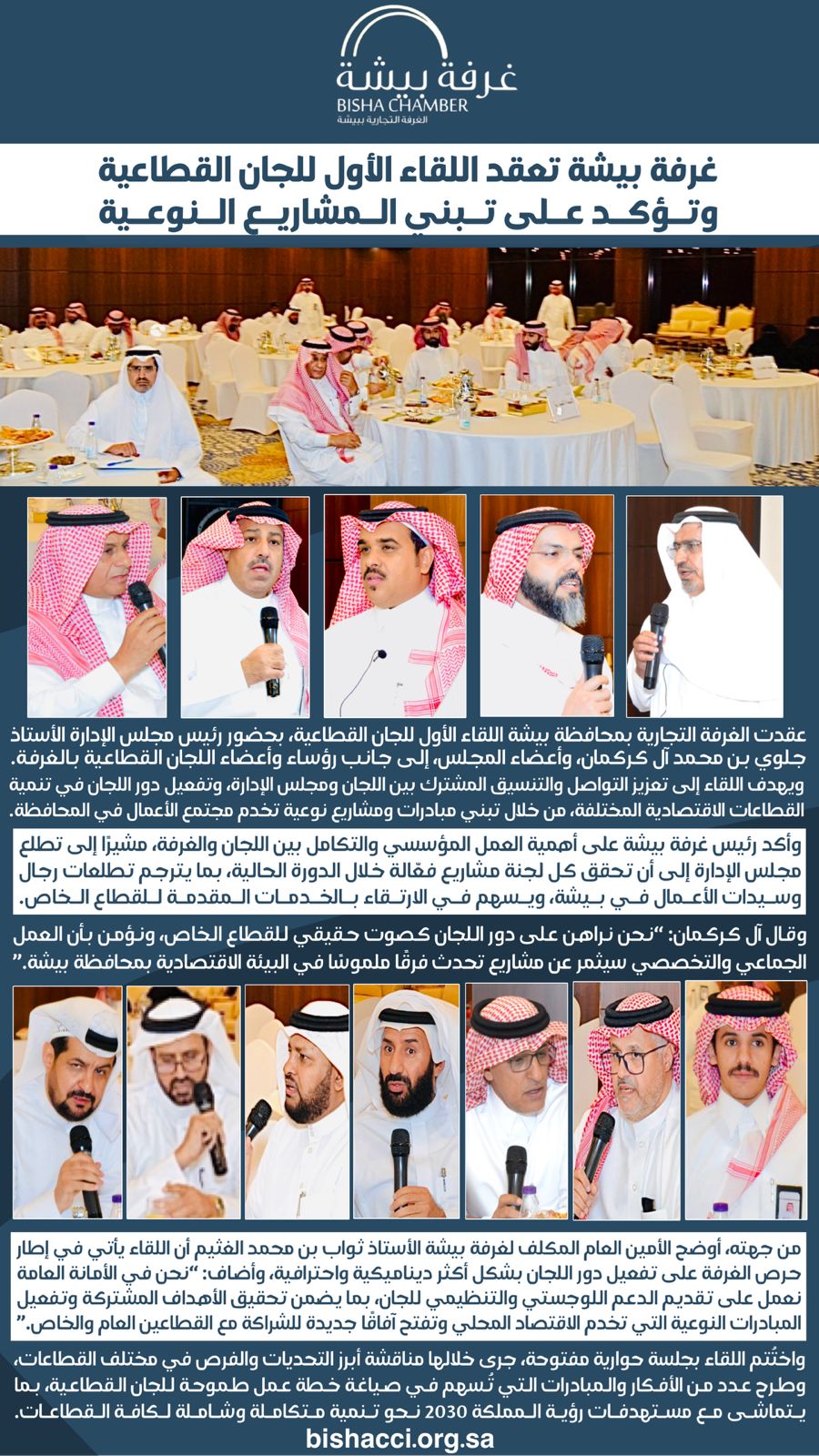 عقدت الغرفة التجارية بمحافظة بيشة اللقاء الأول للجان القطاعية، بحضور رئيس مجلس الإدارة الأستاذ جلوي بن محمد آل كركمان، وأعضاء المجلس، إلى جانب رؤساء وأعضاء اللجان القطاعية بالغرفة.