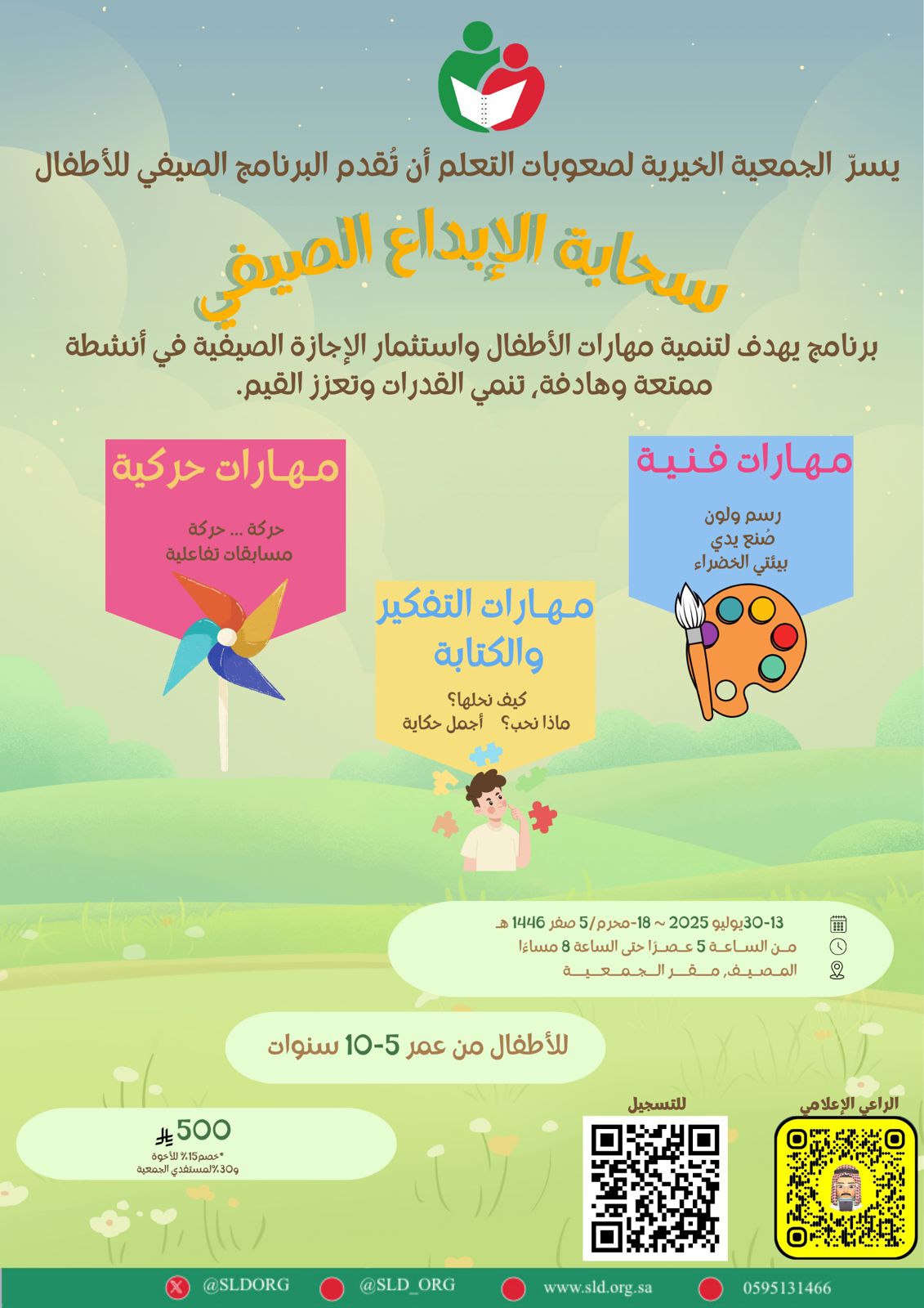 حرصًا على تنمية قدرات الأطفال خلال الإجازة الصيفية، تطلق الجمعية الخيرية لصعوبات التعلّم برنامجها الصيفي النوعي “سحابة الإبداع الصيفي”، وذلك خلال الفترة من يوم الأحد 18 محرم 1447هـ الموافق 13 يوليو 2025م حتى يوم الأربعاء 6 صفر 1447هـ الموافق 30 يوليو 2025م، من الساعة 5:00 حتى 8:00 مساءً، في مقر الجمعية بحي المصيف – الرياض.