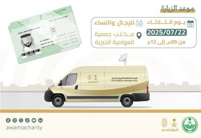 بالتعاون مع إدارة الأحوال المدنية، تستضيف جمعية العوامية الخيرية للخدمات الاجتماعية يوم الثلاثاء 22/7/2025، من الساعة 9 صباحًا وحتى 12:00 ظهرًا، خدمة الوحدات المتنقلة للأحوال المدنية، ضمن مبادرة «نأتي إليك» التي تنفذها وكالة وزارة الداخلية للأحوال المدنية للجهات الحكومية والخاصة.