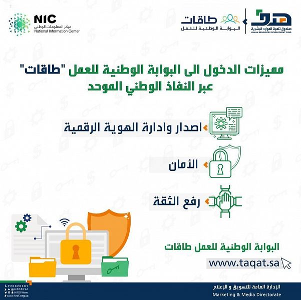 أكد صندوق تنمية الموارد البشرية “هدف”، أن ربط دخول مستخدمي البوابة الوطنية للعمل (طاقات) بخدمة النفاذ الوطني الموحد، يدعم التوجهات الخاصة بسياسات التحول الرقمي الحكومي، ويرفع مستوى الموثوقية والأمان.