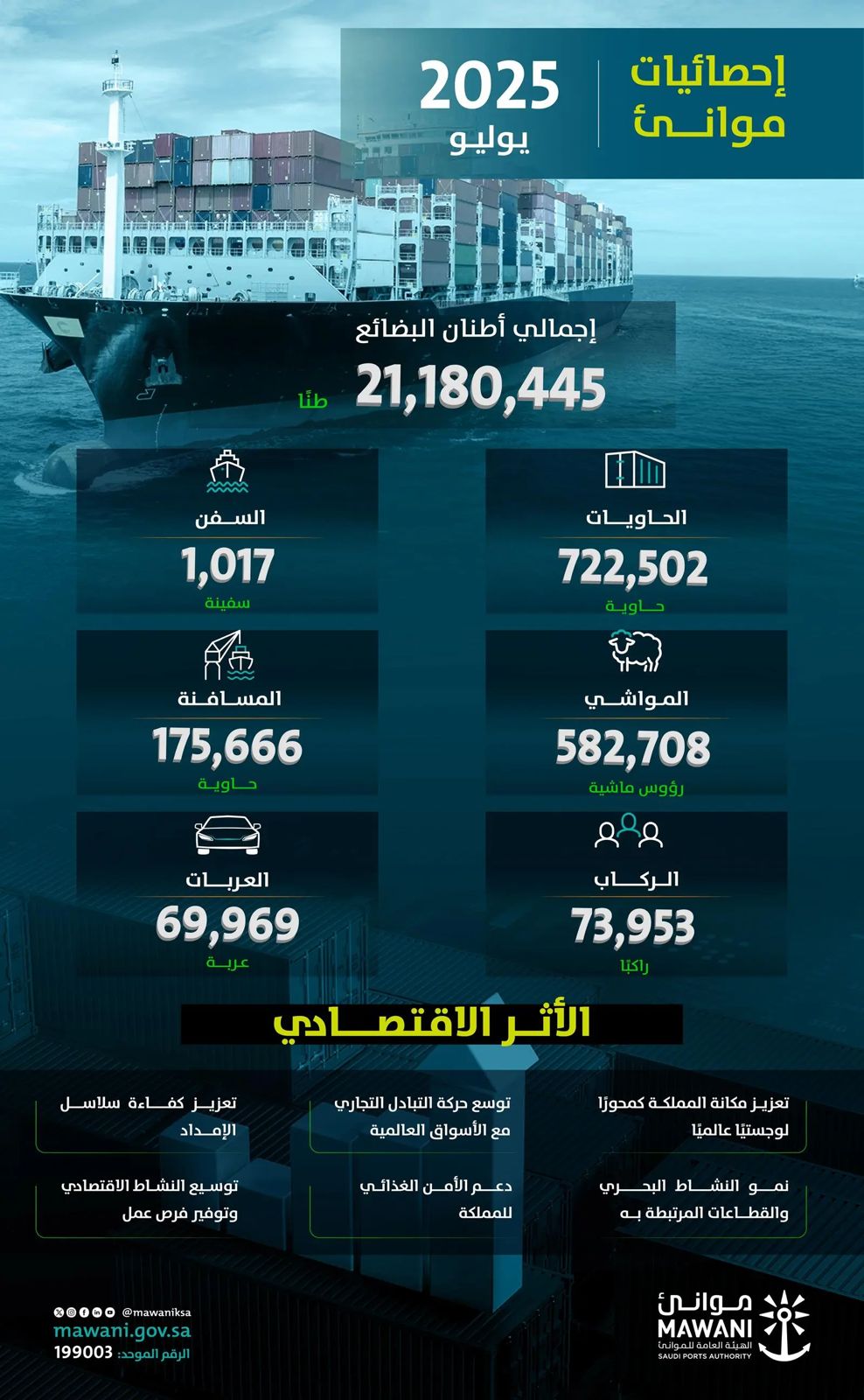 حققت الموانئ التي تشرف عليها الهيئة العامة للموانئ “موانئ” خلال شهر يوليو لعام 2025م ارتفاعًا في أعداد الحاويات المناولة بنسبة 12.01% لتصل إلى (722,502) حاوية قياسية، مقارنة بـ(645,019) حاوية قياسية بالفترة المماثلة من العام الماضي 2024م، كما سجّلت حاويات المسافنة ارتفاعًا بنسبة 35.34% لتصل إلى (175,666) حاوية، مقارنة بـ(129,797) حاوية العام الماضي.