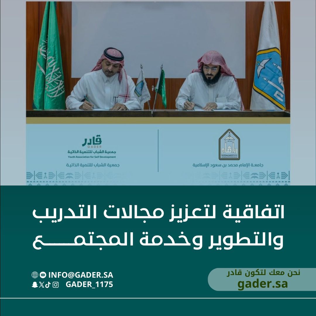 وقّعت جامعة الإمام محمد بن سعود الإسلامية، ممثلةً بعمادة شؤون الطلاب، اتفاقية تعاون مع جمعية الشباب للتنمية الذاتية (قادر) بهدف دعم وتطوير مجالات التدريب والتطوير وخدمة المجتمع.