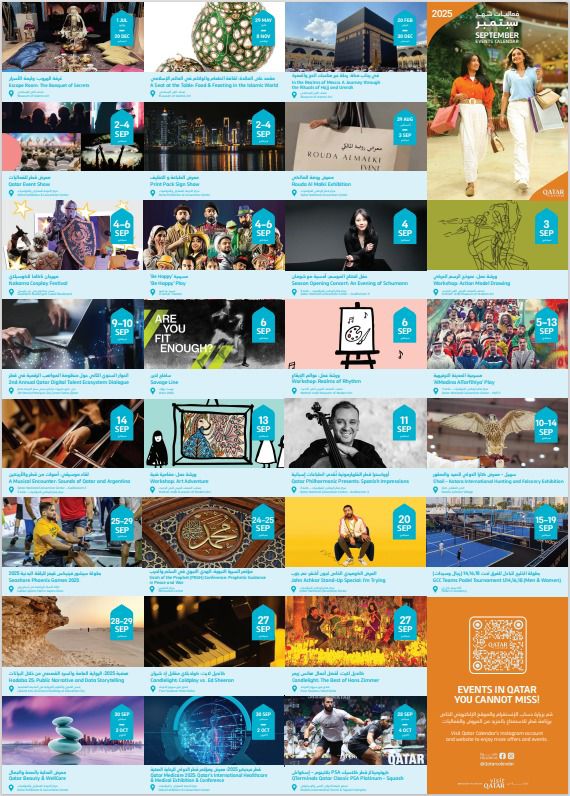 تقدم نسخة شهر سبتمبر 2025 من رزنامة قطر مزيجًا متنوعًا من المعارض الثقافية والعروض الحية وورش العمل الإبداعية والمنتديات المتخصصة والبطولات الرياضية. فمن عروض الصقور التراثية ومهرجانات الأنمي إلى الحفلات الأوركسترالية والمعارض الطبية والتحديات الرياضية، يجمع هذا الشهر بين العمق الثقافي والتفاعل المجتمعي على امتداد الدولة.
