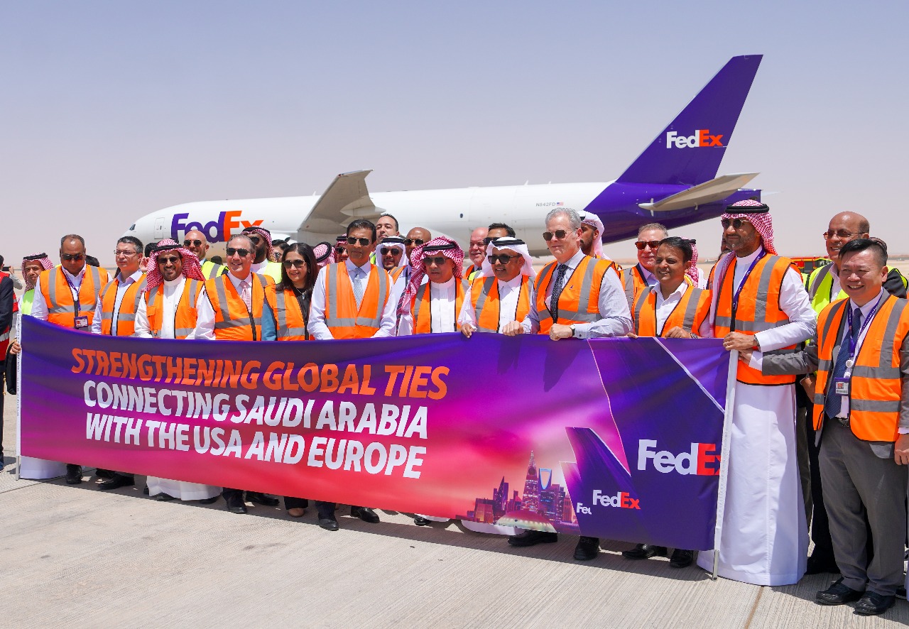 Dr. Rumaih bin Mohammed Al-Rumaih, Vice Minister of Transport and Logistics Services and Acting President of the Transport General Authority; and FedEx executives Raj Subramaniam, President and CEO of FedEx Corporation; Richard Smith, COO, International and CEO, Airline; and Kami Viswanathan, President of FedEx Middle East, Indian Subcontinent and Africa, along with other FedEx leadership, during the inauguration ceremony of the first FedEx flight into Saudi Arabia.
