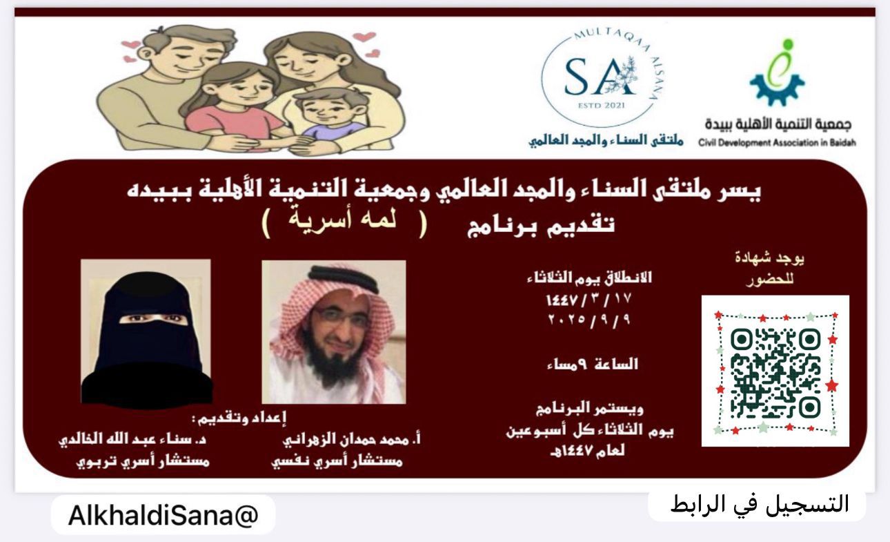 ملتقى السناء تحت رعاية جمعية التنمية الأهلية ببيده ينفذان البرنامج التدريبي تحت عنوان برنامج ( لمه أسرية