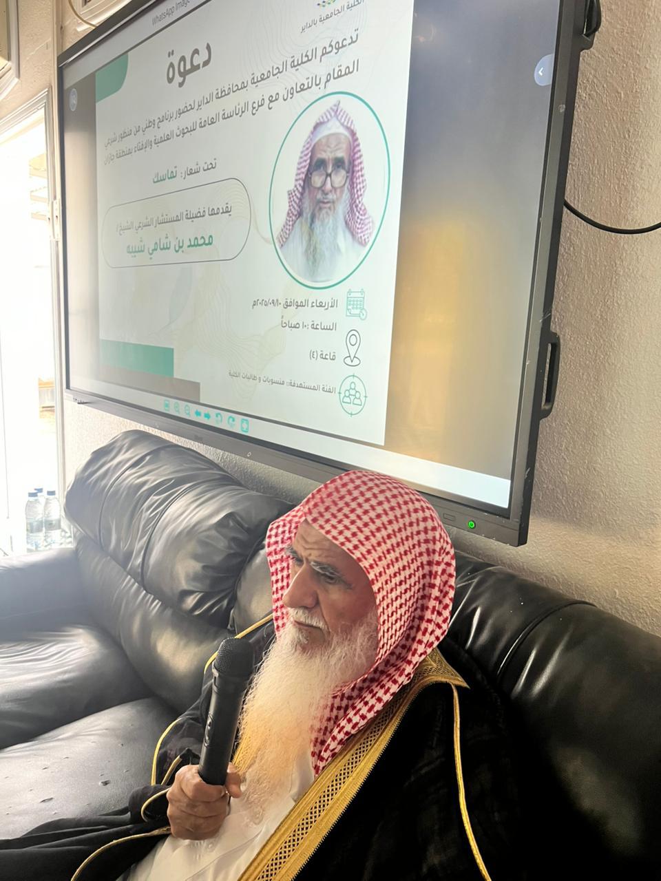 قدّم فضيلة المستشار الشرعي بفرع الرئاسة العامة للبحوث العلمية والإفتاء بمنطقة جازان الشيخ محمد بن شامي شيبه اليوم الأربعاء ندوة بالكلية الجامعية للبنات بالداير ضمن البرنامج الذي ينظمه الفرع بعنوان “تماسك” والذي تم بناءاً على موافقة سمو أمير منطقة جازان حفظه الله وتوجيهات من سماحة مفتي عام المملكة ومعالي نائبه -حفظهم الله- بحضور عميدة الكلية الجامعية للبنات بالداير الدكتوره ميعاد بنت علي احمد صديق وأعضاء هيئة التدريس ومنسوبات وطالبات الكلية.