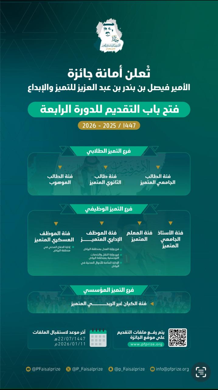 أعلن الأمين العام لجائزة الأمير فيصل بن بندر بن عبد العزيز للتميز والإبداع، الدكتور نايف بن عابد الزارع. عن بدء استقبال طلبات التقديم للدورة الرابعة لعام 1447هـ/2025-2026م على موقع الجائزة الإلكتروني www.pfprize.org