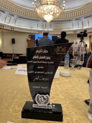 وقام بتسليم دروع التكريم سيادة اللواء طارق مهدي وزير الاعلام الاسبق رئيس شرف الرابطة والاعلامي خالد حسنين مؤسس الرابطة والسيد عادل حنفي ممثل الرابطة في المملكة العربيه السعوديه