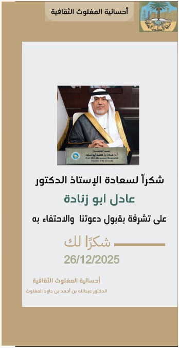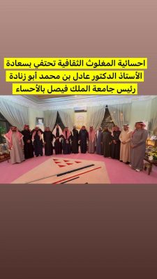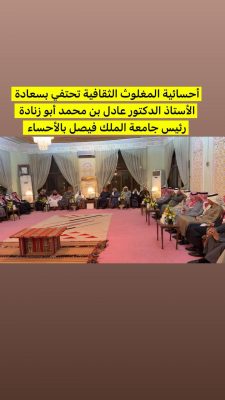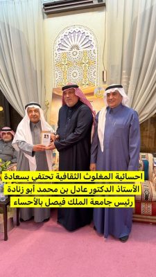 احتفى الدكتور عبد الله بن أحمد المغلوث، صاحب أحسائية المغلوث الثقافية، بسعادة الأستاذ الدكتور عادل بن محمد أبو زنادة، رئيس جامعة الملك فيصل بالأحساء، وذلك بحضور نخبة من الأكاديميين وأعضاء هيئة التدريس، إلى جانب عدد من رجال الأعمال، في مزرعة المغلوث الأحمدية.