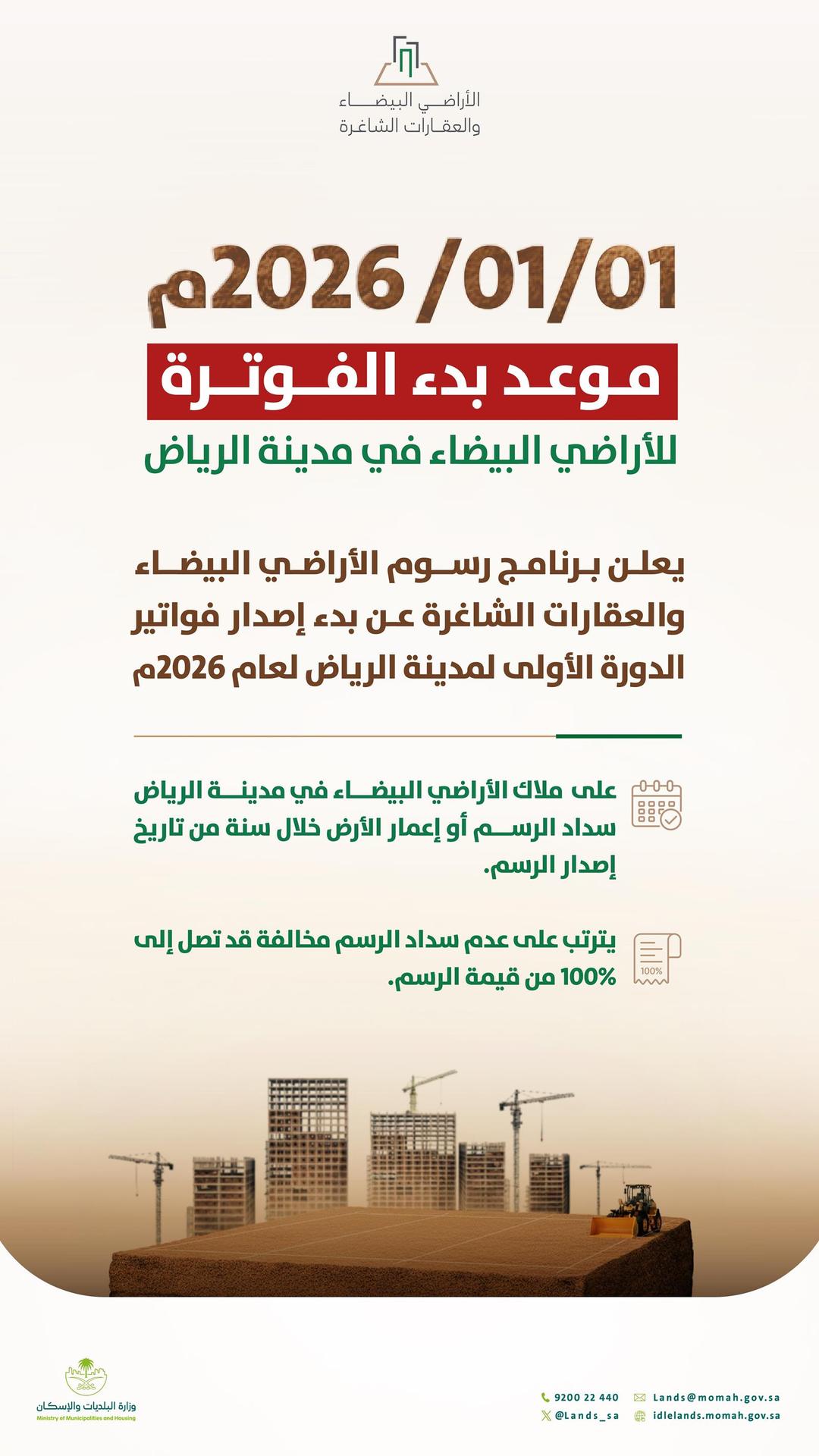 أعلنت وزارة البلديات والإسكان ممثلة ببرنامج رسوم الأراضي البيضاء والعقارات الشاغرة اليوم الخميس، عن بدء إصدار أكثر من 60 ألف فاتورة لرسوم الأراضي البيضاء في مدينة الرياض، امتدادًا لتوجيهات صاحب السمو الملكي الأمير محمد بن سلمان بن عبدالعزيز آل سعود ولي العهد رئيس مجلس الوزراء – حفظه الله -، الهادفة إلى تنظيم السوق العقاري وتحقيق التوازن بين العرض والطلب.