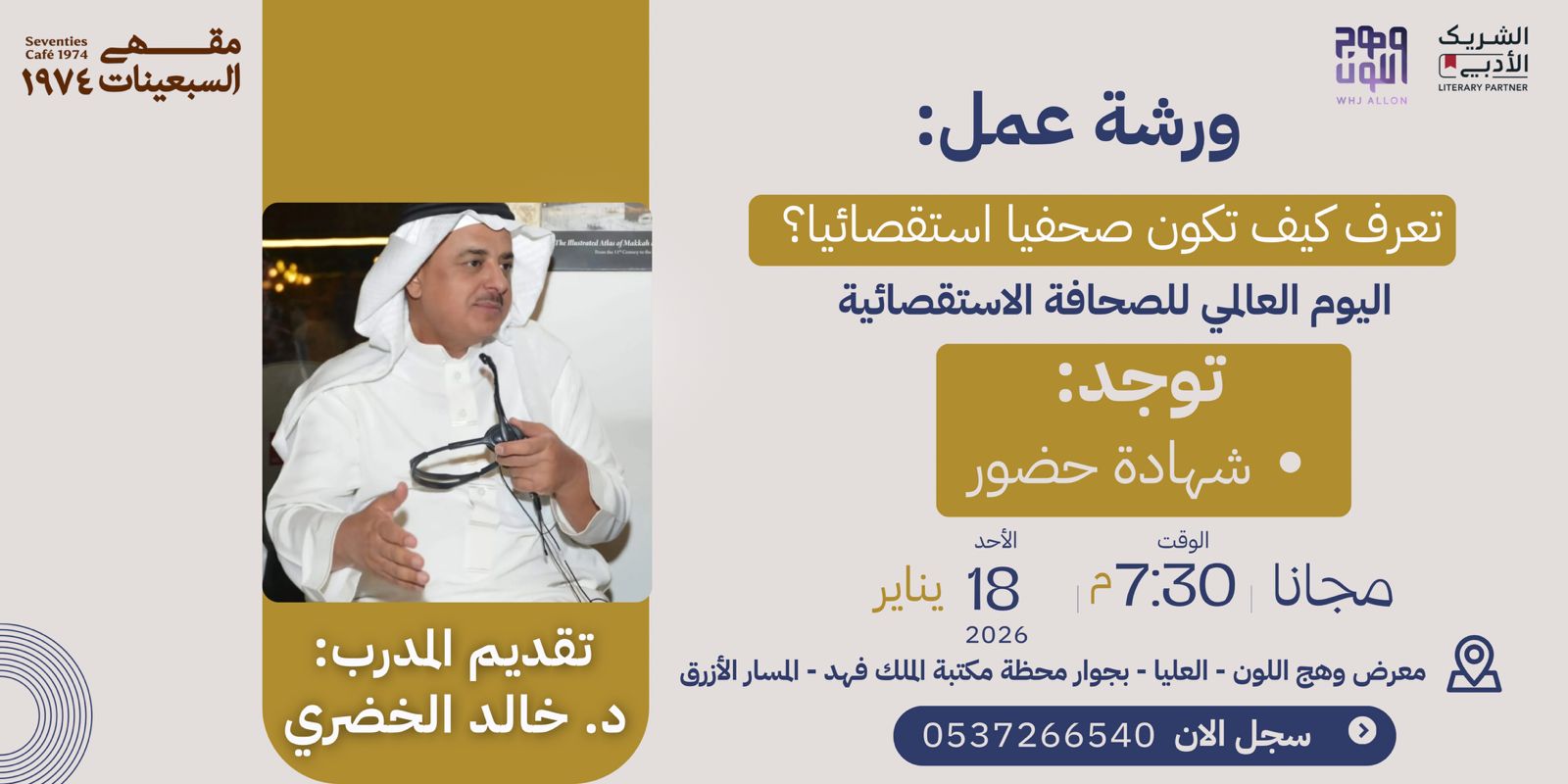 ينظم مقهى السبعينات الثقافي بالرياض، بالتعاون مع وِهج اللون يوم الأحد القادم ١٨ يناير ورشة عمل متخصصة بعنوان: «تعرف كيف تكون صحفيًا استقصائيًا؟»، يقدمها المدرب والخبير الإعلامي الدكتور خالد الخضري، أحد أبرز الأسماء التدريبية في مجال الصحافة والإعلام على مستوى المملكة والوطن العربي.