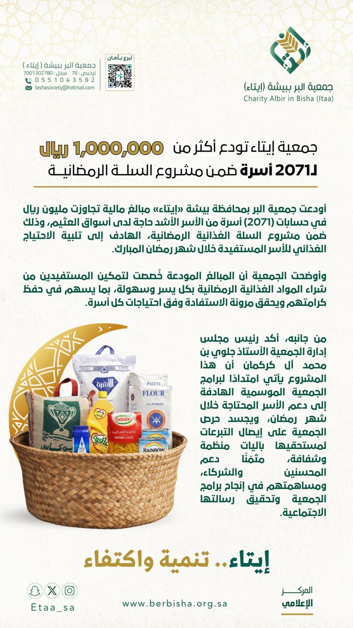 أودعت جمعية البر بمحافظة بيشة «إيتاء» مبالغ مالية تجاوزت مليون ريال في حسابات (2071) أسرة من الأسر الأشد حاجة لدى أسواق العثيم، وذلك ضمن مشروع السلة الغذائية الرمضانية، الهادف إلى تلبية الاحتياج الغذائي للأسر المستفيدة خلال شهر رمضان المبارك.
