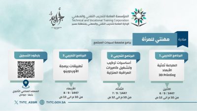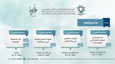 تطلق الإدارة العامة للتدريب التقني والمهني بمنطقة عسير اعتباراً من يوم الأثنين القادم الموافق السادس من شهر رمضان المبارك عدد من المبادرات والبرامج التدريبية ضمن مبادرة أجاويد ٤ والتي تهتم بعدد من شرائح المجتمع بالمنطقة .