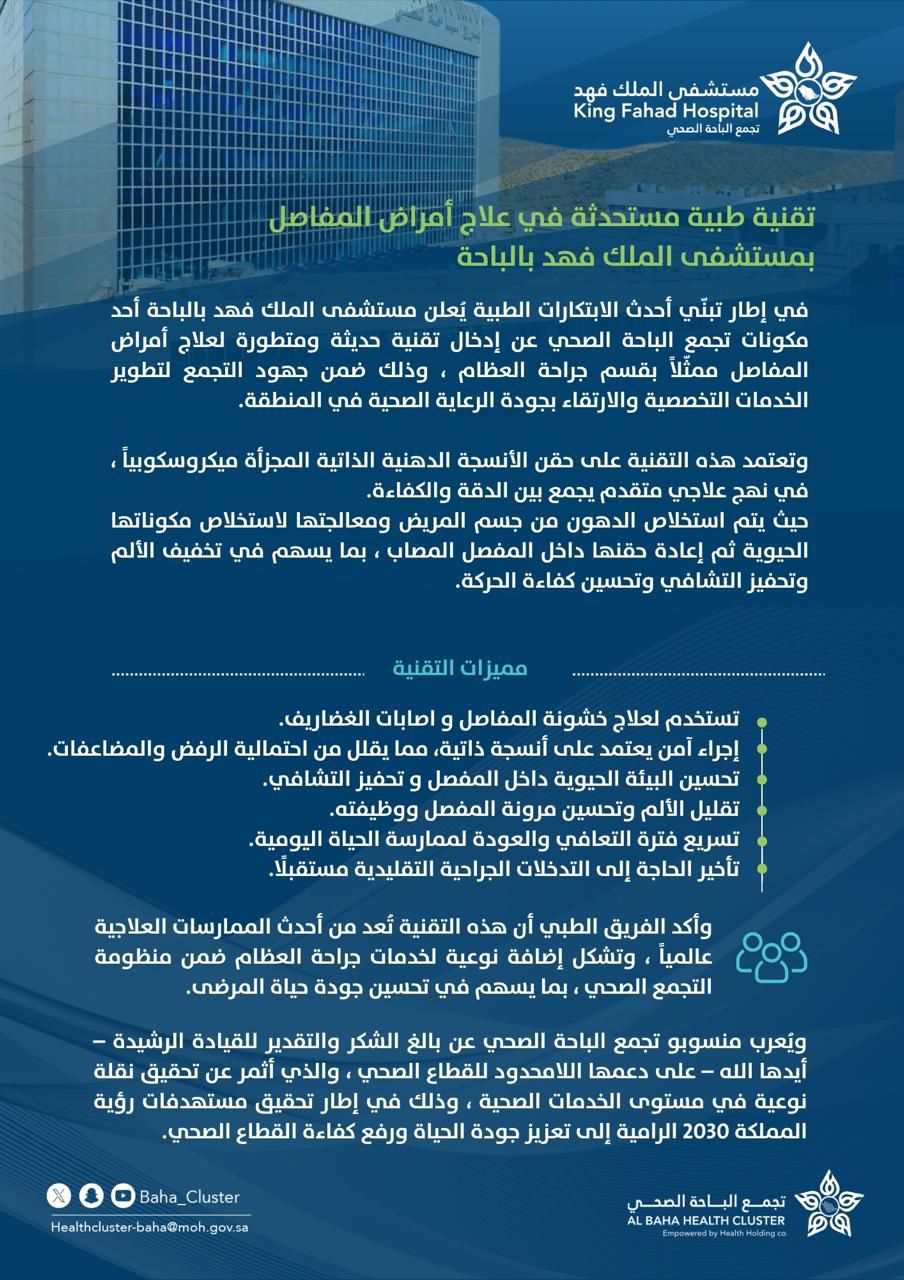 في إطار تبنّي أحدث الابتكارات الطبية يُعلن مستشفى الملك فهد بالباحة أحد مكونات تجمع الباحة الصحي عن إدخال تقنية حديثة ومتطورة لعلاج أمراض المفاصل ممثّلاً بقسم جراحة العظام ، وذلك ضمن جهود التجمع لتطوير الخدمات التخصصية والارتقاء بجودة الرعاية الصحية في المنطقة.