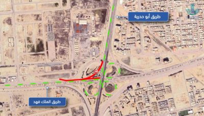 وبيّن أن المرحلة الأولى تشمل تنفيذ الأعمال بطول 500 متر، في الجزء الواقع قبل التقاطع، وحتى ما قبل المخرج المؤدي إلى طريق الملك فهد بن عبد العزيز، مع تطبيق إغلاق جزئي للطريق، وإغلاق بعض المداخل والمخارج حسب الحاجة، وتوجيه القادمين من طريق أبو حدرية باتجاه المطار إلى استخدام المنحدرات البديلة لإتمام حركة الالتفاف.