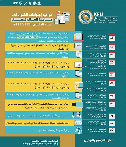 أخبار محلية > جامعة الملك فيصل تعلن عن مواعيد إجراءات القبول للعام الجامعي 1441-1442هـ