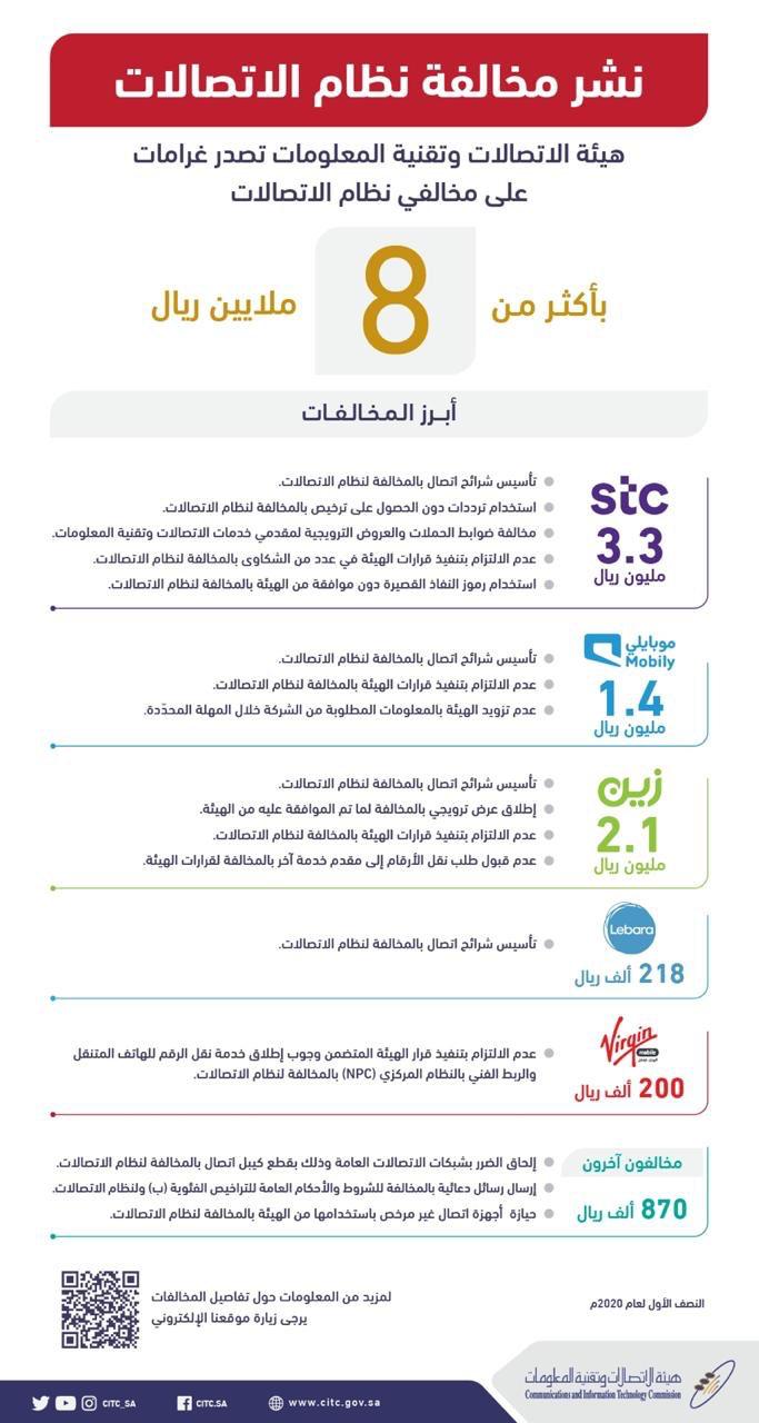 نشرت هيئة الاتصالات وتقنية المعلومات عبر موقعها الإلكتروني مجموعة من القرارات الصادرة عن لجنة النظر في مخالفات نظام الاتصالات تضمنت عقوبات بغرامات مالية تجاوزت مبلغ 8 ملايين ريال ضد عدد من مقدمي الخدمة المخالفين لنظام الاتصالات، من بينهم شركة الاتصالات السعودية  “STC”، وشركة اتحاد اتصالات “موبايلي”، وشركة الاتصالات المتنقلة السعودية “زين”، وشركة اتحاد جوراء للاتصالات وتقنية المعلومات “ليبارا موبايل”، وشركة اتحاد “فيرجن موبايل”، إضافة إلى مخالفين آخرين؛ بسبب ارتكاب عدة مخالفات لنظام الاتصالات.