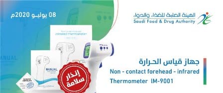 أصدرت الهيئة العامة للغذاء والدواء إنذارًا يتعلق بسلامة جهاز قياس الحرارة عن بعد “Non- contact forehead- infrared Thermometer lM-9001″، الذي تنتجه شركة Shenzhen Anboson Industries Co. Ltd الصينية؛ بسبب ظهور قراءات غير دقيقة لدرجات حرارة الجسم.