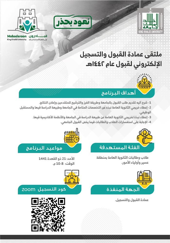 تنظم عمادة القبول والتسجيل بجامعة الملك خالد مساء الأحد 21 ذي القعدة ملتقى عمادة القبول الإلكتروني لعام 1442هـ.