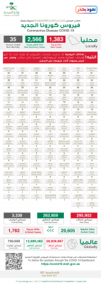 أعلنت وزارة #الصحة السعودية – اليوم الجمعه الموافق 14/8 /2020 عن تسجيل (1383) حالة إصابة جديدة بفيروس #كورونا الجديد (كوفيد19)، وتسجيل (35) حالات وفيات رحمهم الله، وتسجيل (2566) حالة تعافي ليصبح إجمالي عدد الحالات المتعافية (262,959) حالة ولله الحمد.