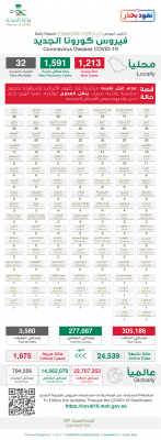 أعلنت وزارة #الصحة⁩ السعودية اليوم الجمعه عن تسجيل (1213) حالة إصابة جديدة بفيروس ⁧#كورونا⁩ الجديد (كوفيد19)، وتسجيل (32) حالات وفيات رحمهم الله، وتسجيل (1591) حالة تعافي ليصبح إجمالي عدد الحالات المتعافية (277,067) حالة ولله الحمد.