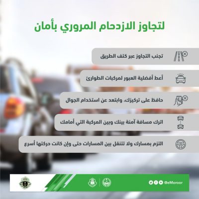 نشر الحساب الرسمي للمرور السعودي عبر موقع التغريدات القصيرة تويتر، إنفوجرافًا يحوي 5 نصائح لتجاوز الازدحام المروري بأمان، تتلخص في تجنب التجاوز، ومنح أفضلية المرور لسيارات الطوارئ، والتركيز، وترك مسافة آمنة، والالتزام بالمسار.