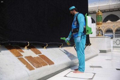 كثفت الرئاسة العامة لشؤون الحرمين ممثلة بإدارة الوقاية البيئية ومكافحة الأوبئة عمليات التعقيم والعناية الخاصة بسلم الكعبة وصحن المطاف وتعقيم ثوب الكعبة مستخدمين أحدث التقنيات وأجود أنواع المعقمات التي تم جلبها بعناية خاصة للمسجد الحرام.