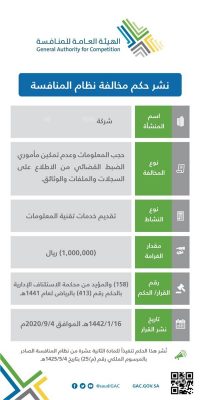 نشرت الهيئة العامة للمنافسة أمس (الجمعة) حكم مخالفة نظام المنافسة والصادر بحق شركة خاصة بتقديم خدمات تقنية المعلومات .