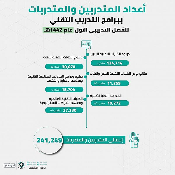 أعلنت المؤسسة العامة للتدريب التقني والمهني عن زيادة الطاقة الاستيعابية للمتدربين والمتدربات للعام التدريبي الحالي 1442هـ، حيث بلغ عدد المتدربين المستمرين في مختلف البرامج التدريبية من الجنسين للفصل التدريبي الأول 241,249 متدرباً ومتدربة، وبلغ إجمالي عدد المتدربين في مرحلة البكالوريوس بالكليات التقنية للبنين والبنات 11259 متدربا ومتدربة، فيما يبلغ عدد المتدربات بالكليات التقنية للبنات 30070 متدربة، في حين يصل عدد المتدربين في الكليات التقنية للبنين 134714 متدربا، وفي الكليات التقنية العالمية ومعاهد الشراكات الإستراتيجية التي يتم تشغيلها بالشراكة مع قطاع الأعمال يبلغ عدد المتدربين والمتدربات 27230 متدربا ومتدربة، ويصل عدد متدربي دبلوم وبرامج المعاهد الصناعية الثانوية والعمارة والتشييد 18704 متدربين، وفي المعاهد الأهلية العليا يبلغ عدد المتدربين والمتدربات 19272 متدربا ومتدربة .