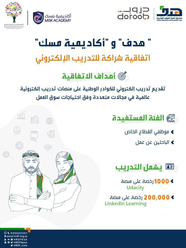 أبرم صندوق تنمية الموارد البشرية (هدف) اتفاقية شراكة مع أكاديمية مسك للتدريب، لدعم تنفيذ برنامج تدريب إلكتروني في عدة مجالات لتأهيل وتدريب القوى الوطنية من موظفي القطاع الخاص والباحثين عن عمل وتعزيز فرص توظيفهم في القطاع الخاص من خلال المنصة الوطنية للتدريب الإلكتروني (دروب).