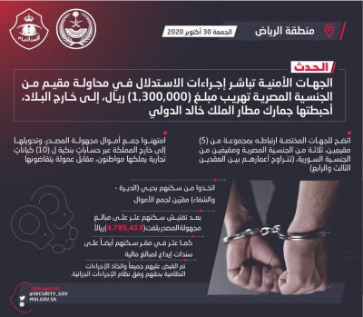 صرّح مساعد المتحدث الإعلامي لشرطة منطقة الرياض الرائد خالد الكريديس، بأن الجهات الأمنية باشرت إجراءات الاستدلال في محاولة مقيم من الجنسية المصرية تهريب مبلغ (1,300,000) ريال، إلى خارج البلاد، أحبطتها جمارك مطار الملك خالد الدولي، واتضح للجهات المختصة ارتباطه بمجموعة من (5) مقيمِين، ثلاثة من الجنسية المصرية ومقيمَين من الجنسية السورية، تتراوح أعمارهم (بين العقدين الثالث والرابع)، امتهنوا جمع أموال مجهولة المصدر، وتحويلها إلى خارج المملكة عبر حساباتٍ بنكية ل (10) كياناتٍ تجارية يملكها مواطنون، مقابل عمولة يتقاضونها، متخذين من سكنهم بحيي (الديرة – والشفاء) مقرّين لجمع الأموال، وبتفتيشهما عثر على مبالغ مجهولة المصدر، بلغت (4,785,413) ريالاً، بالإضافة لسندات إيداع لمبالغ مالية، وتم القبض عليهم جميعاً، واتخاذ الإجراءات النظامية بحقهم وفق نظام الإجراءات الجزائية.
