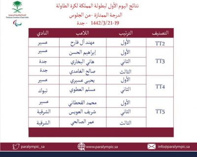 وجاء في المركز الأول اللاعب مهند آل فارح في تصنيف TT2 , واللاعب إبراهيم الحسن في المركز الأول في تصنيف TT3 , واللاعب يحيى عسيري في المركز الأول في تصنيف TT4 ، فيما حقق اللاعب محمد القحطاني في المركز الأول في تصنيف TT5 .