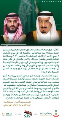 تحل ذكرى البيعة السادسة لمولاي خادم الحرمين الشريفين الملك سلمان بن عبدالعزيز -حفظه الله- في يوم الأربعاء ٣ ربيع الآخر ۱۶۶۲ه، الموافق ۱۸ نوفمبر ۲۰۲۰م، وبلادناالغالية تنعم -بفضل من الله- بالأمن والأمان في ظل هذا العهد الميمون، وبتلاحم وطني فريد بين القيادة الرشيدة وأفراد الشعب السعودي الكريم في وطن عقدنا العزم على أن نجعله مصدر إلهام للعالم برؤيته وإنجازاته، لتكمل