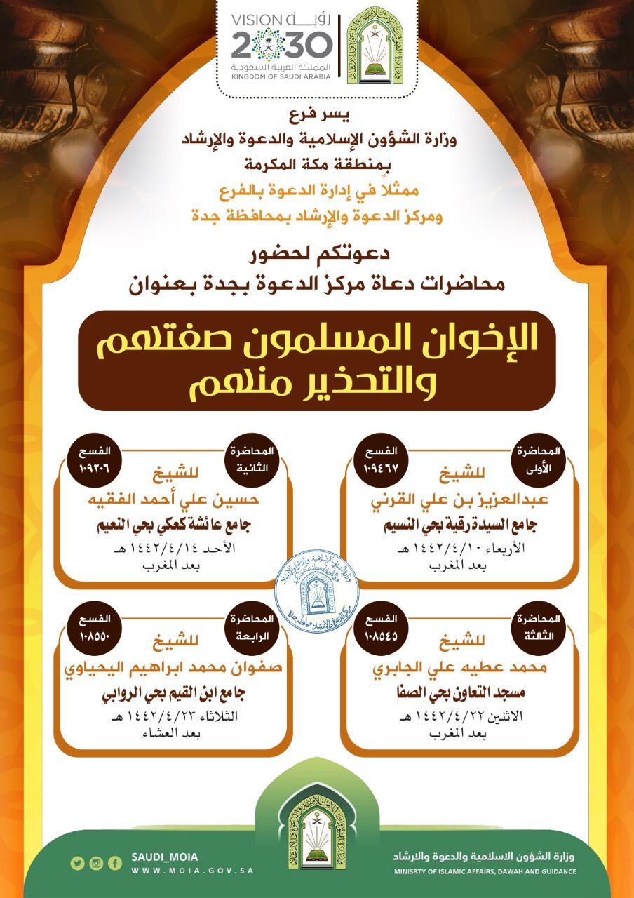 يواصل فرع وزارة الشؤون الإسلامية والدعوة والإرشاد بمنطقة مكة المكرمة، تنظم عدداً من المحاضرات بعنوان: (الإخوان المسلمون.. صفتهم والتحذير منهم) خلال شهر ربيع الآخر الجاري، يلقيها دعاة الفرع في عدد من جوامع ومساجد محافظة جدة بعد صلاتي المغرب والعشاء.. حيث تلقى اليوم في جامع عائشة كعكي بحي النعيم بعد المغرب.