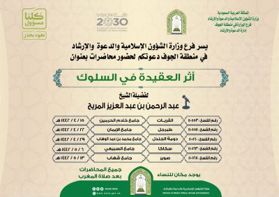 كما يلقي الشيخ عبدالرحمن بن عبدالعزيز المريح يوم غدٍ محاضرة بعنوان: (أثر العقيدة في السلوك) في جامع خادم الحرمين بالقريات، وفي الثاني والعشرين في جامع الإيمان بطبرجل، وفي التاسع والعشرين من الشهر الجاري بجامع محمد بن عبدالوهاب بدومة الجندل، وفي اليوم السادس والثالث عشر من الشهر القادم يلقيها في جامع السبيعي بسكاكا، وجامع شهاب بصوير.